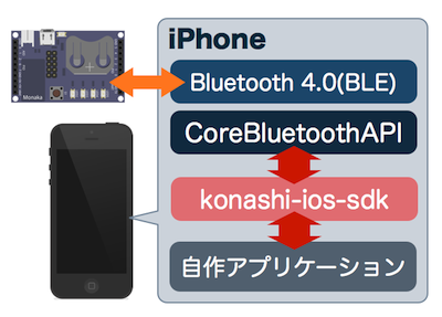 を行なっているので、konashiとiPhoneアプリの通信のハンドリングを意識することやMPUのプログラミングをせずに、iPhoneアプリからkonashiを簡単にコントロールすることができるようになっています。