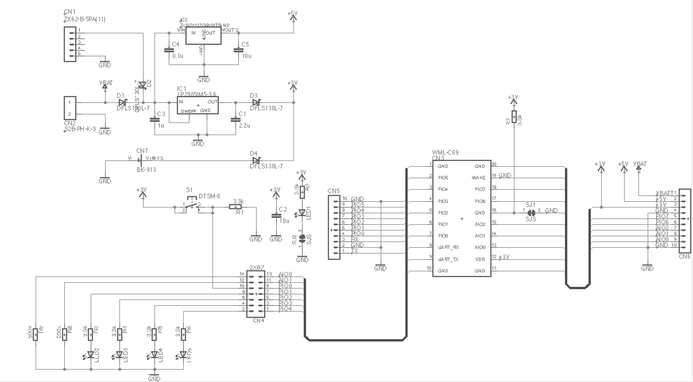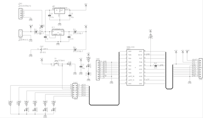 センサデバイスなど繋げるICによっては電源電圧が最低でも 3.0 [V] 必要なデバイスがあるのでIC1を 3.6 [V] にしたことで接続できるICの選択肢を広げました。