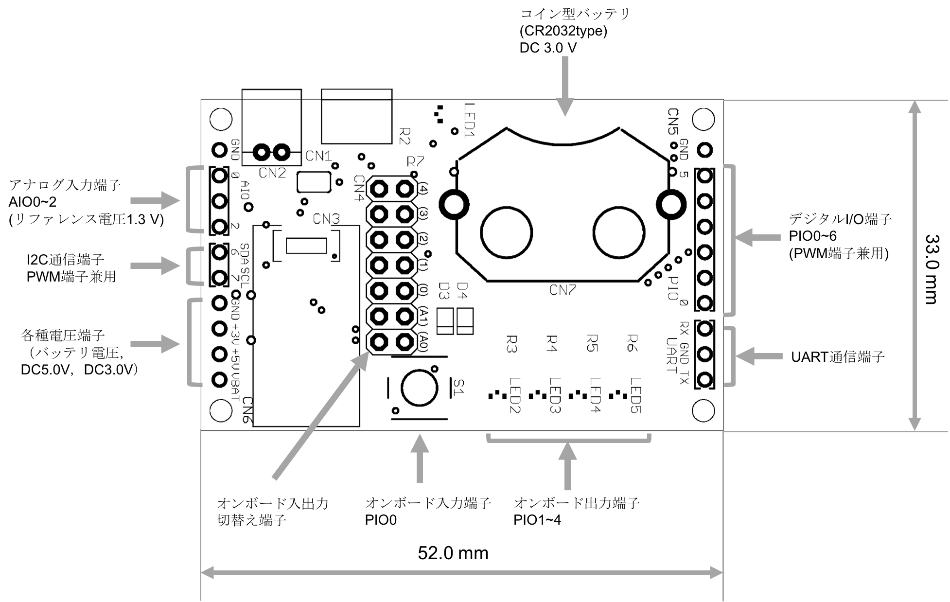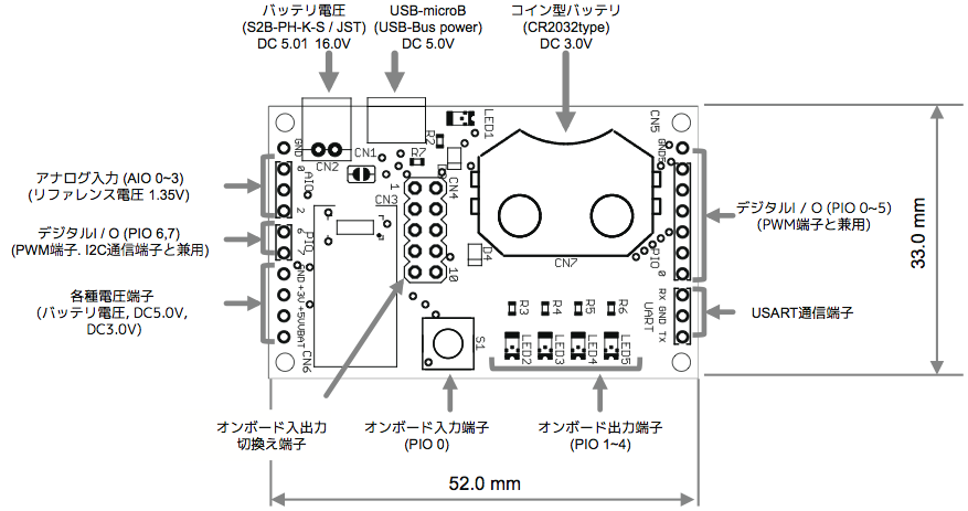 PIOのピン数の変更(8->6) DAC(アナログ出力)未対応 UARTの対応baudrateを追加 UARTで複数バイトを一度に送受信を可能に I2Cで一度に送受信できるバイト数を、20から16に変更 BLEのService,CharacteristicのUUIDを変更 PWMを出せるピンがPIO0-2の3本のみに変更 PWM波形の仕様変更 OTAファームウェアアップデートに対応 |