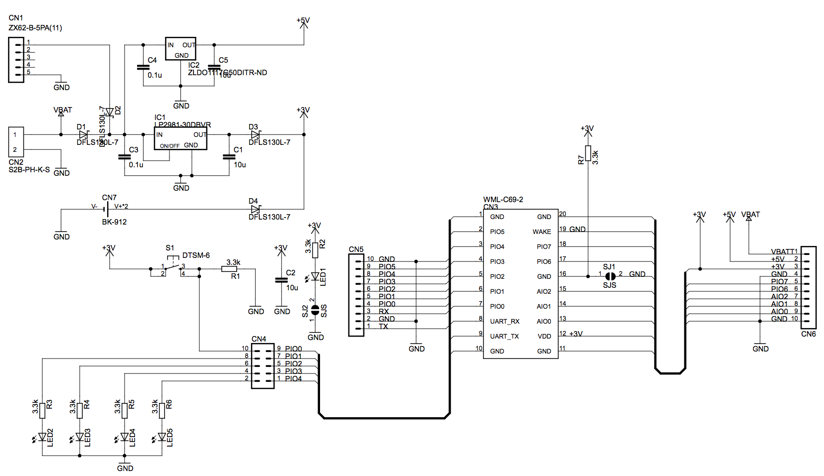 konashi 2 ではIC1の電圧が 3.0 [V] で後段のダイオードで 0.3 [V] 電圧が落ちるため、konashi 3 ではIC1