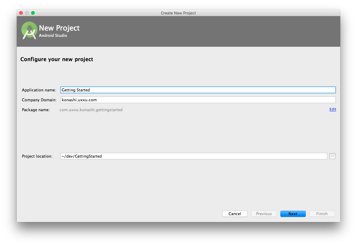 プロジェクト名・保存場所・Android SDKのバージョン入力します。