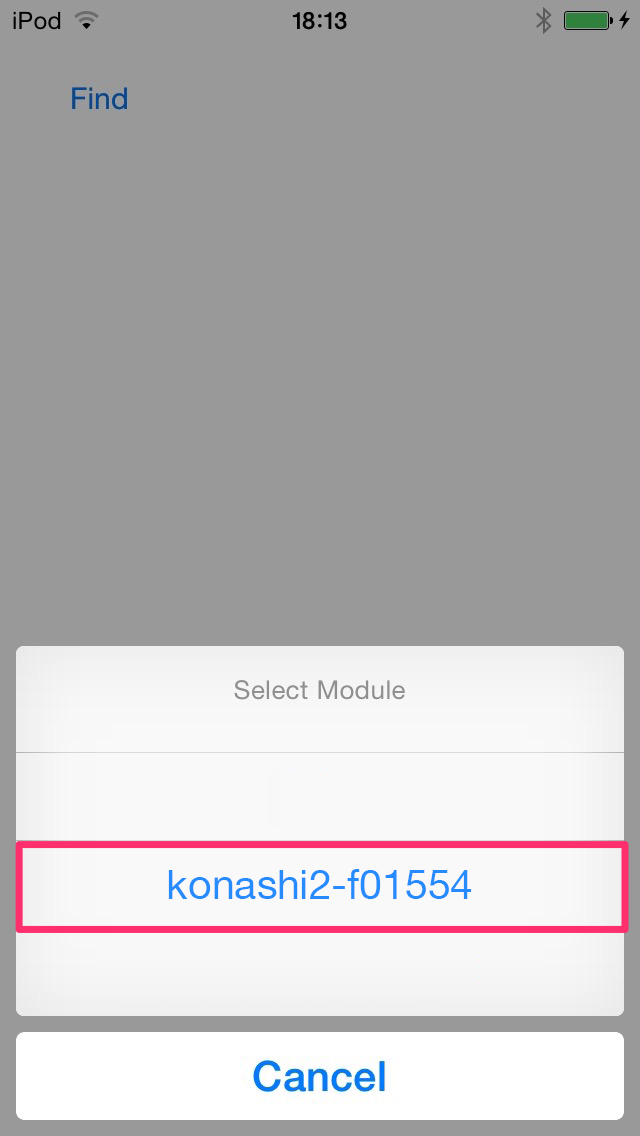 すると接続できる konashi のリストが表示されるので、接続する konashi を選択し、 Done ボタンをタップしてください。