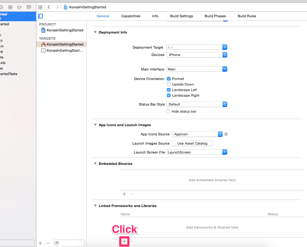 プロジェクトの「Targets」のプロジェクト名と同じ名前のターゲットを選択、「General」を表示し、Linked frameworks and Libraries の+ボタンをクリックします。