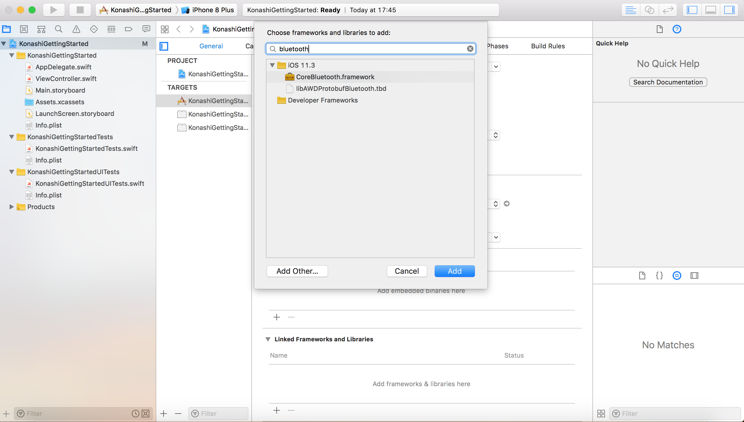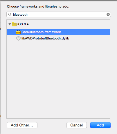 検索ボックスに「bluetooth」と入力すると, CoreBluetooth.framework が表示されるので追加します。