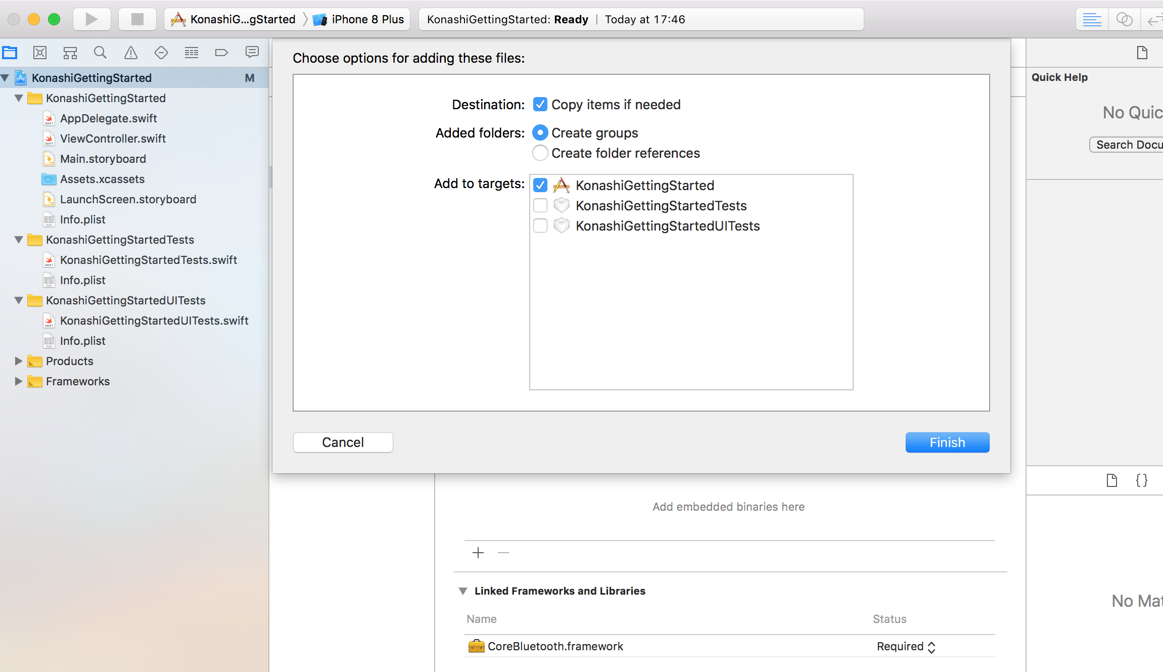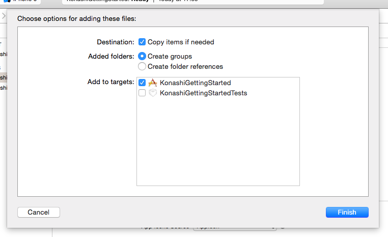 1.で取得したソースの中にあるkonashi-ios-sdk/Konashi/Konashi ディレクトリをプロジェクトにドラッグ&ドロップして追加します。