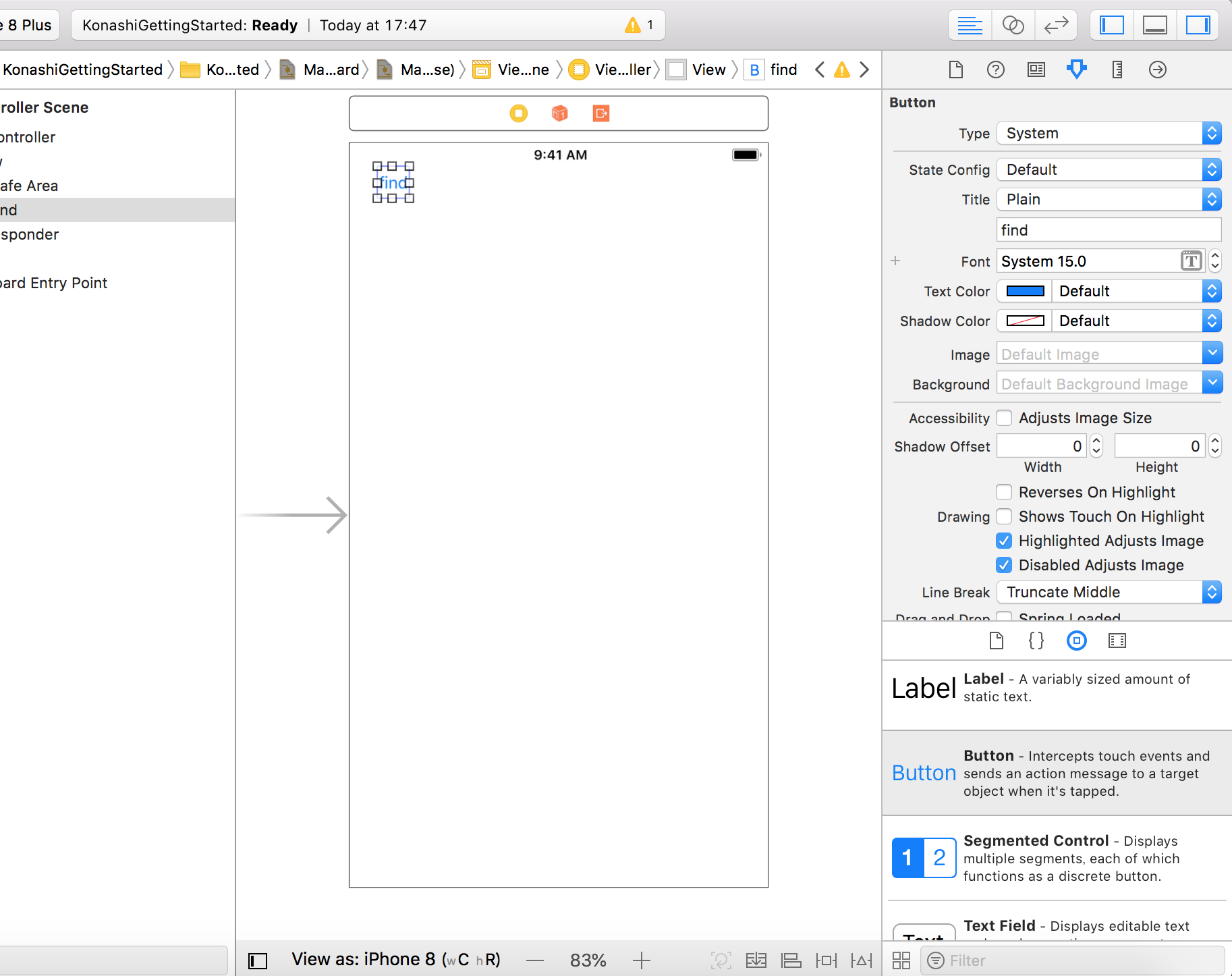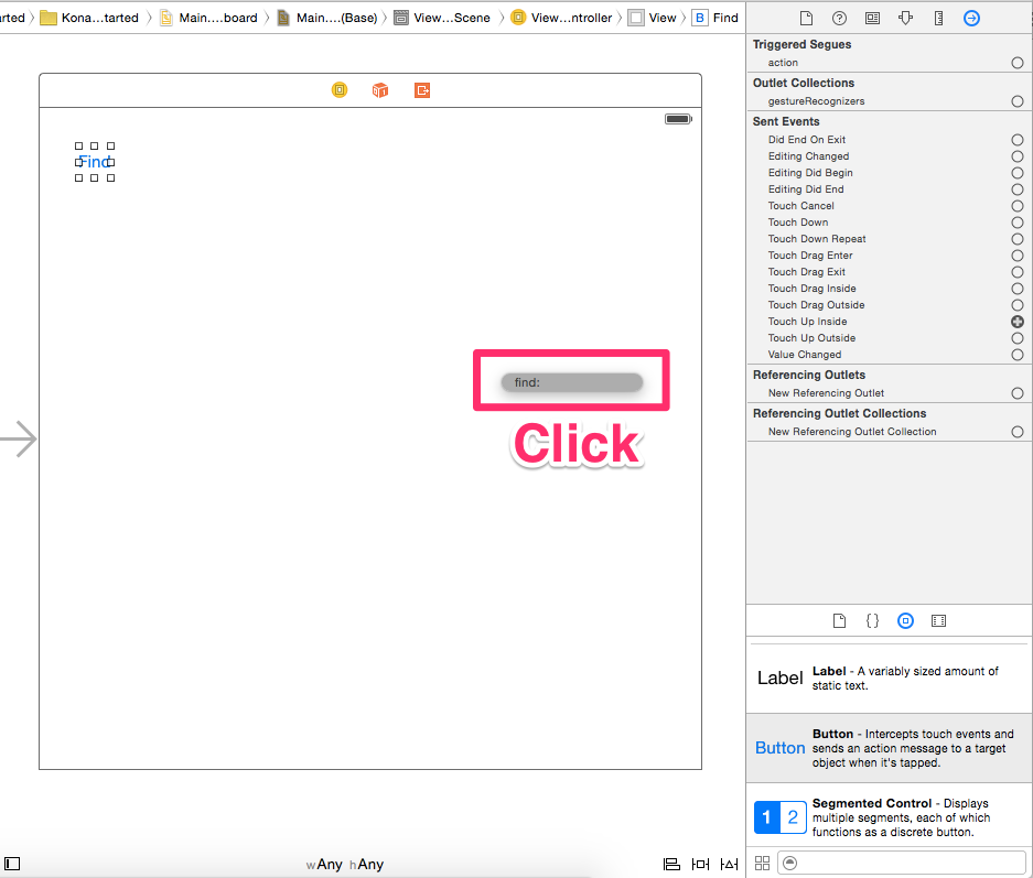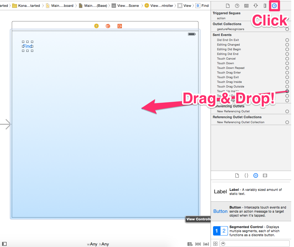 まずFindボタンを選択し、右上のメニューから丸右矢印をクリック。"Touch Up Inside"から図示のようにView Controllerへドラッグ&ドロップ。