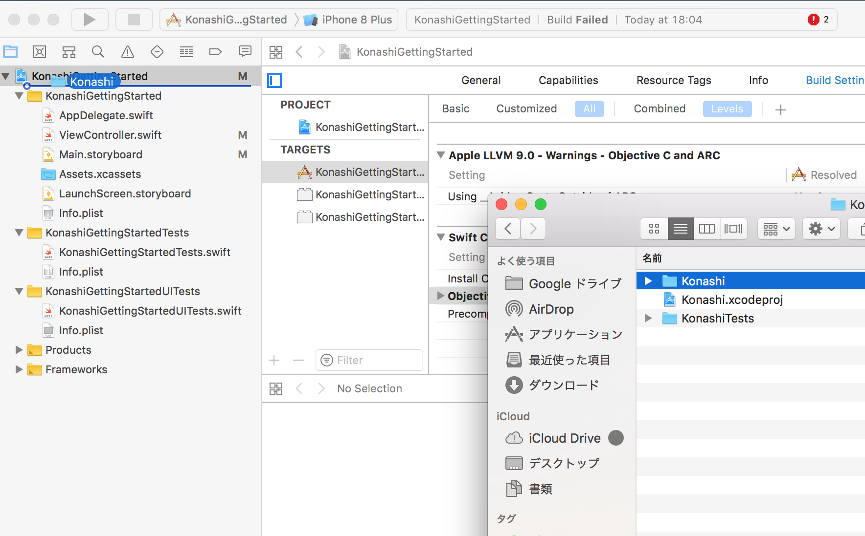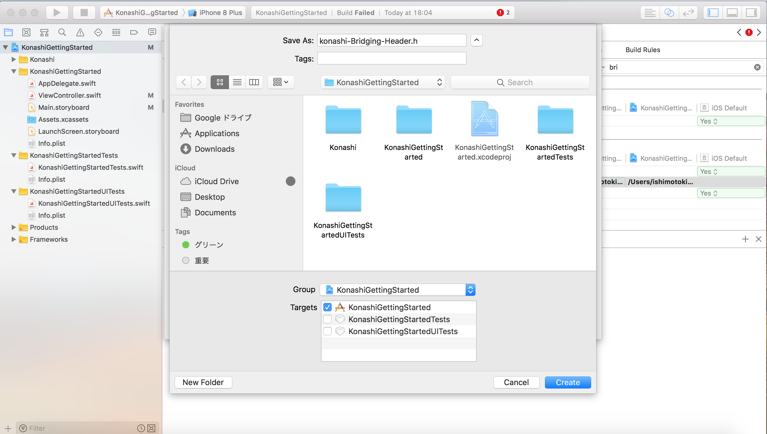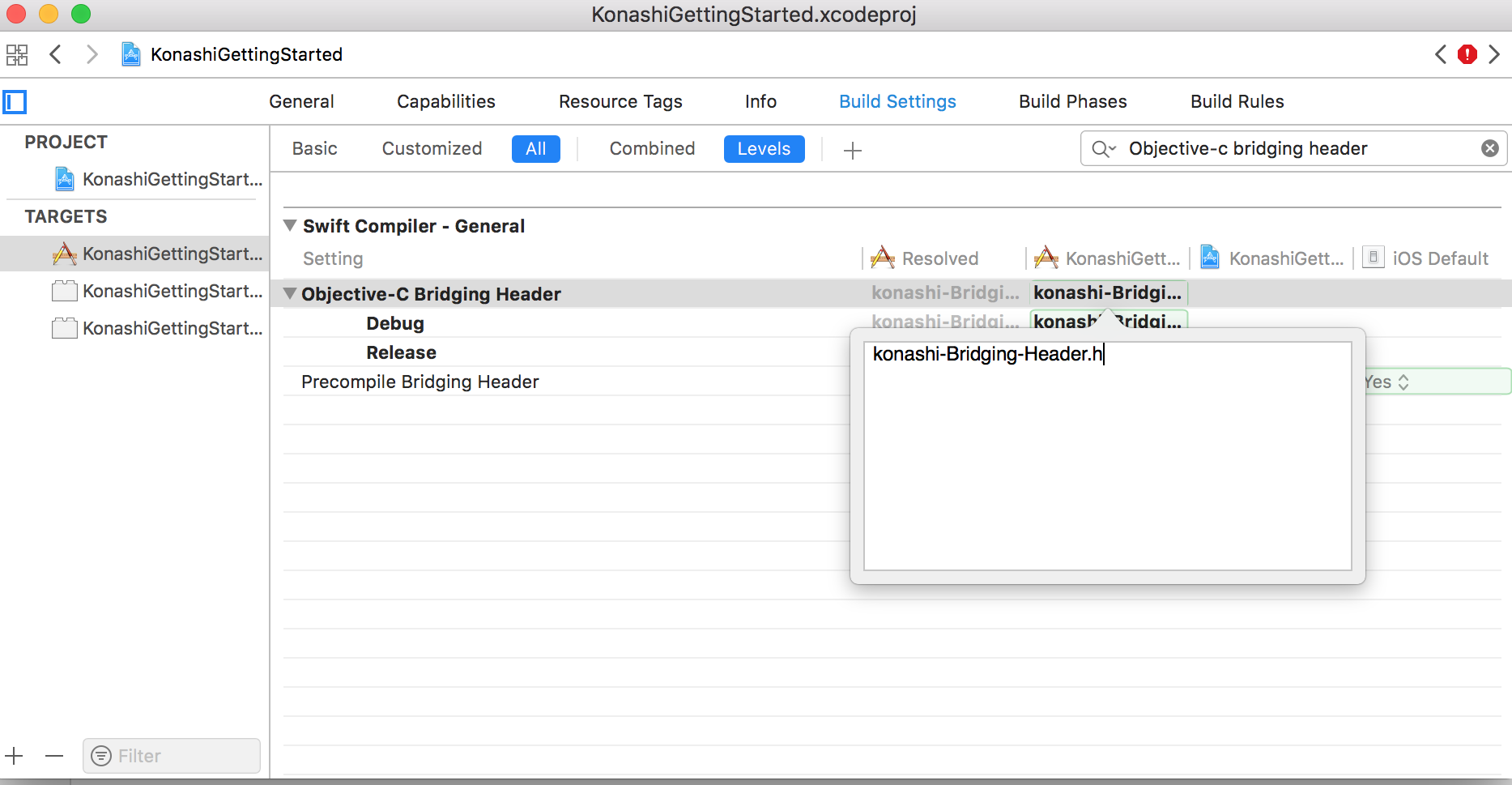KonashiGettingStartedのBuild Setting内でObjective-c Bridging Headerと検索します。Objective-c Bridging Headerに先ほど作成したheaderファイルのパスを入れます。