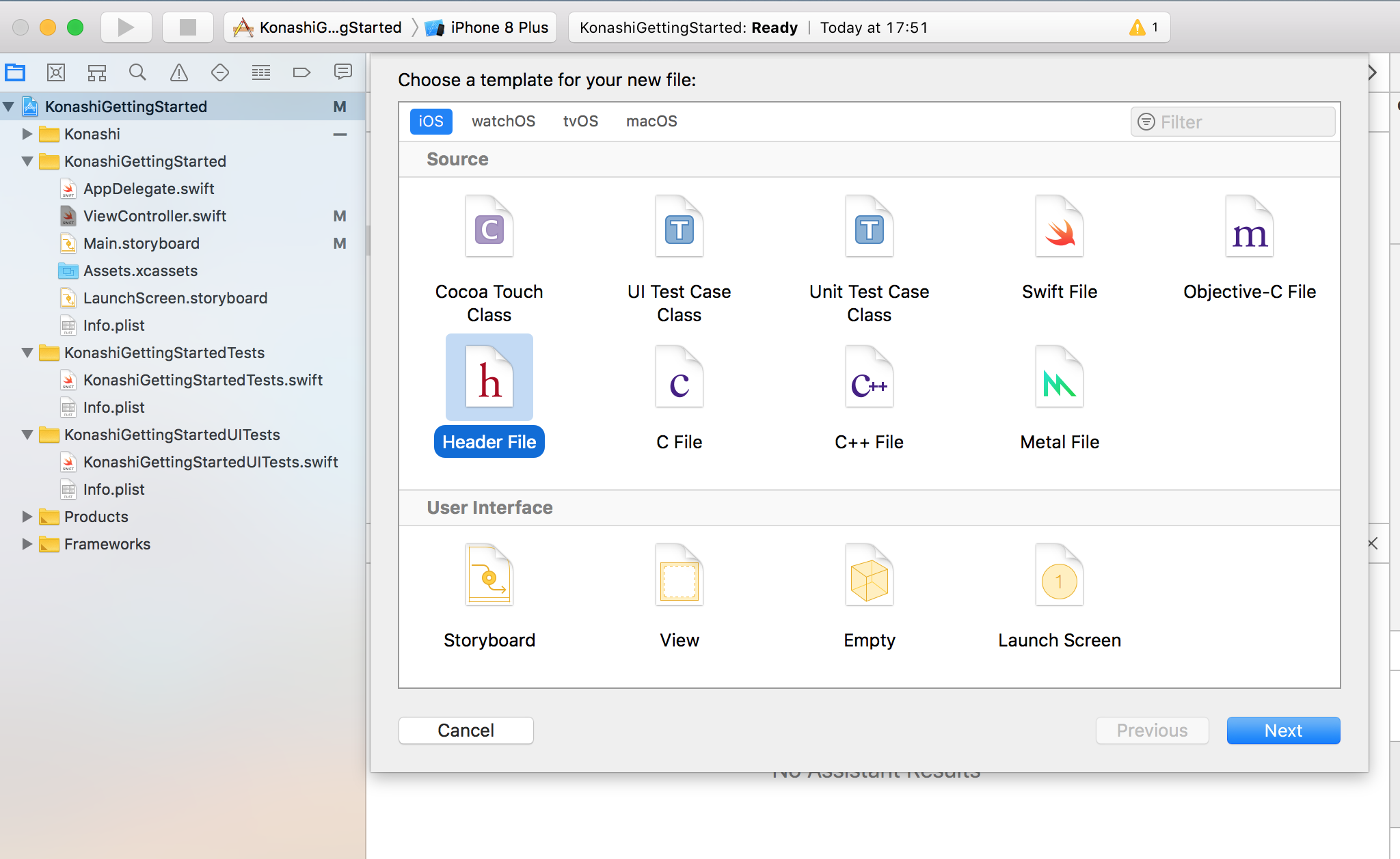 今回はファイル名をkonashi-Bridging-Header.hにします。konashi-Bridging-Header.hのkonashiは任意の名前でも大丈夫です。